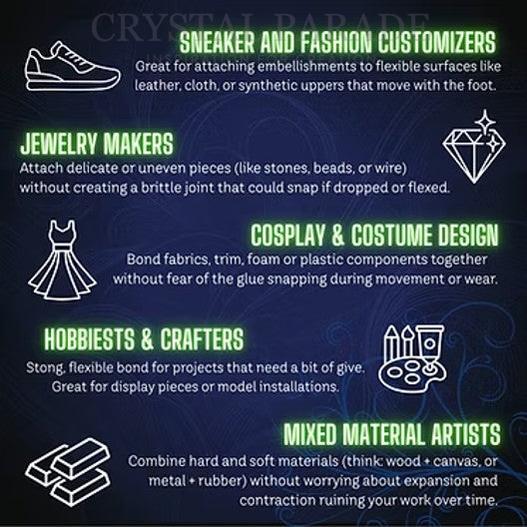 Introducing the crystal glue that's taking the world by storm - GEMIFLEX™ by Gluemasters, USA. Now available exclusively at Crystal Parade, the UK's only stockist.